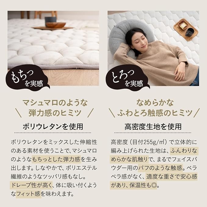 とろけるようななめらかな質感とマシュマロのようなもちっとした弾力。横になった瞬間から、ずっと触れていたくなるような気持ち良さです。