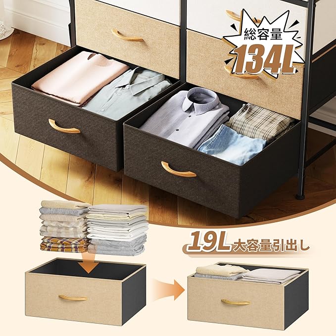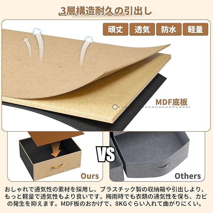 【頑丈で通気性よい三層構造】REIBII洋服タンスは耐久性に優れた3層構造を採用します。引き出しの中間部と底部はMDF板、表面と側面はおしゃれで通気性の良い不織布仕様です。ブラスチック製の収納箱や引出しより、もっと軽量で透気性もより良いです。梅雨時でも衣類の通気性を保ち、カビの発生を抑えます。