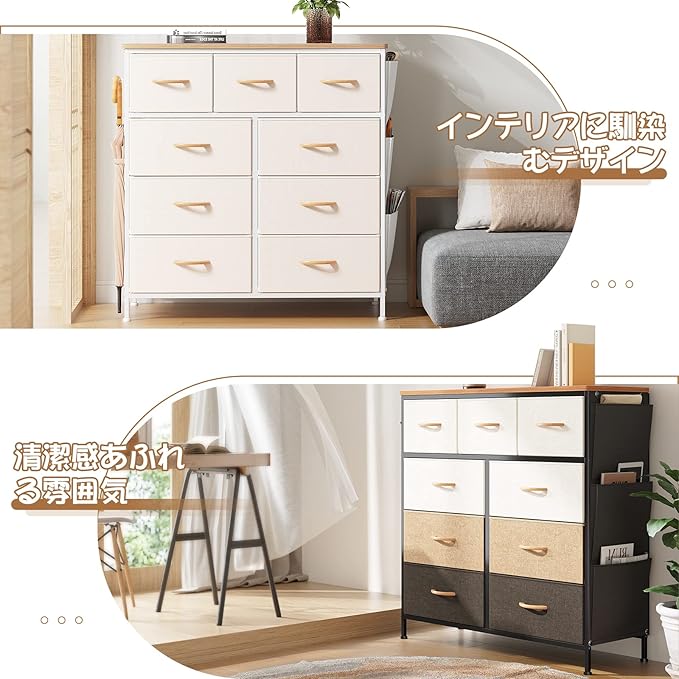 REIBII チェスト 収納 タンス 洋服タンス 4段9杯 134L大容量 おしゃれ リッピング収納 サイド袋&金属フック付き 箪笥 組立簡単 転倒防止 衣装棚 衣類収納 【幅81 奥行30 高さ93cm】 布製 引き出し 北欧风 キャメル
