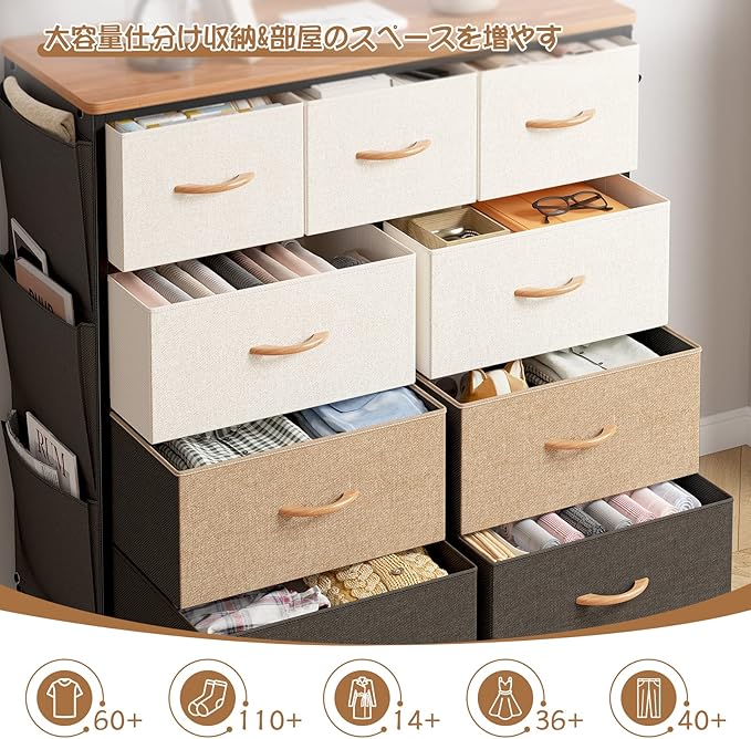 【4段9杯の134L大容量チェスト】この収納チェストは9杯で約134Lとたっぷり収納、一人分の季節の服をすっきり収納できます。引き出しごとに分類して使えるので、探し物もすぐに見つかり、非常に便利です。衣類収納はもちろん、おもちゃや本、日用品から化粧品まで、家中のあらゆるものをきれいに収納できます。さらに、特別な工夫として「付け替え可能なサイドポケット」と「丈夫な金属フック」を装備。毎日使う傘やバッグ、鍵など、よく使うものをさっと取り出せる場所に収納できるので、生活がより快適になります。