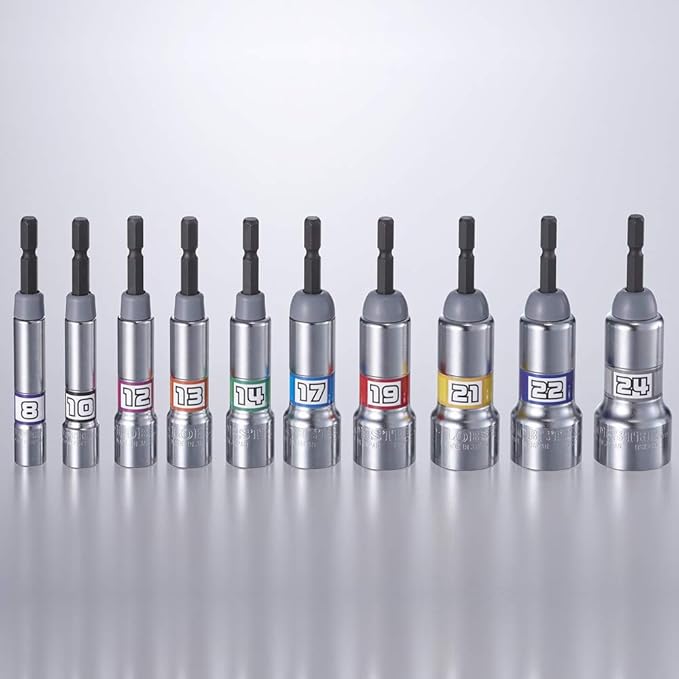 ●業界トップクラスの軸強度を実現しました。●基本的な形状の電ドルソケットです。●長軸のトーション効果により、長寿命です。●ソケット部の六角穴に六角軸を圧入することで、ねじれ・折れに強く、トルク伝達効率が高いです。●深穴式になっており、雄ネジの飛び出しが長い場合でも使用可能です。●ボルト・ナットを確実にとらえ、面接触で角を傷めません。