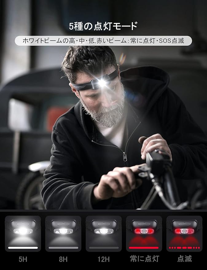 【5種の点灯モードと記憶機能】へっどらいとは5種の点灯モードを提供:ホワイトビームの高・中・低;赤いビーム:常に点灯;緊急用のSOS点滅。前回の点灯モードを自動的に記憶して、毎回点灯モードを選択の面倒を除く。特定の点灯モードに4秒以上止まったら選択は承認します、その時多機能ボタンを押すと電源オフできます