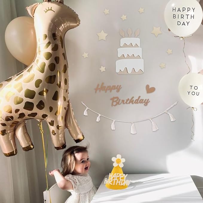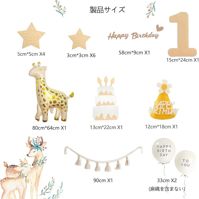 【華やかなハッピーバースデーの装飾セット】 happy birthdayフェルト生地バナーx1、ケ-キ飾り*1個、星*9個、キリン バルーンx1、ケーキトッパーx1、90cmタッセルタペストリーx1、バルーンx2などが含まれています。