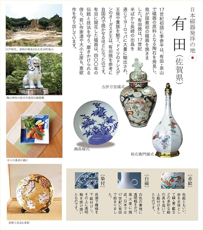 陶磁器の産地として400年の歴史を持つ有田焼。有田は佐賀県西部に位置し、日本で初めて磁器が生産されたことで有名。日本を代表する伝統工芸品です。
