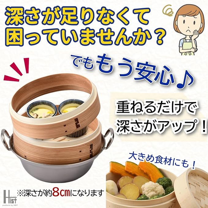 【せいろ専用台輪】ハイストの「台輪」はは竹製や杉製のセイロをご使用の際、セイロの身(本体)に重ねて使用します。セイロの深さが足りない時に「せいろ専用台輪」を重ねると深さが増し、大きめの食材や、茶わん蒸しなどの高さがある食器でも蒸すことができます。