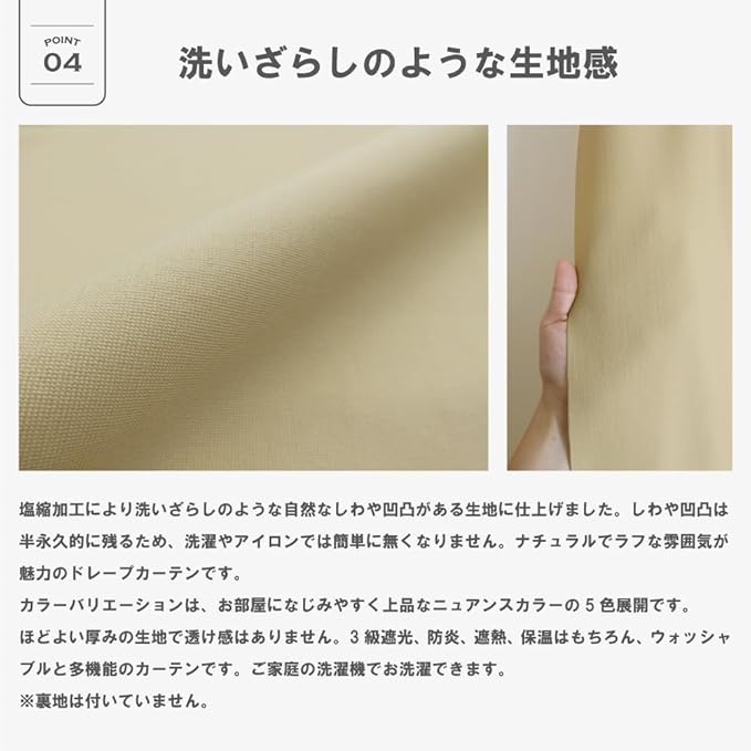 塩縮加工により洗いざらしのような自然のしわや凹凸がある生地を使用しております。しわや凹凸は半永久的に残るため、洗濯やアイロンでは簡単に無くなりません。また特殊な編み機で生地を製造しているので、サイドと裾は無縫製が可能になり、裾がだぶつかずに自然なドレープ感を生み出すことができました。3級遮光、防炎、遮熱、保温はもちろん、ウォッシャブルと多機能のカーテンです。ご家庭の洗濯機でお洗濯できます。生地の製造、染色加工、縫製と一貫した国内生産。安心安全なこだわりの製品です。調節可能なアジャスターフックが付いています(洗濯の時はフックを外してください)。無縫製のサイドと裾は、お洗濯してもほつれません。【注意点】※カラーに関してはモニターの発色により多少異なる場合があります。