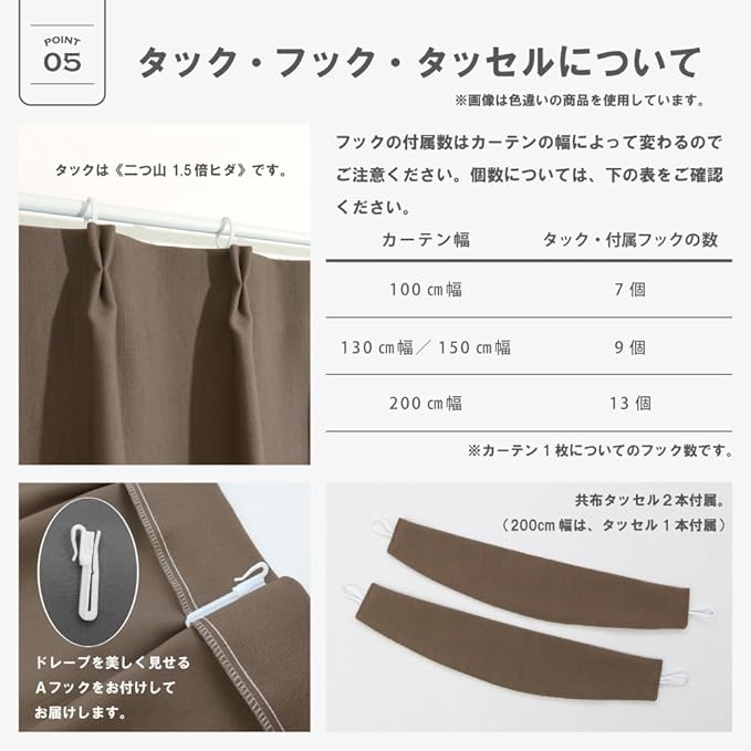 【仕様】1.5倍ヒダ、2つ山仕上げ。調節可能なアジャスターフック付き(Aフック)。 共布タッセル2本付属(200cm幅はタッセル1本付属)。 ※130、150、200cm幅は、生地に継ぎ目が入ります。