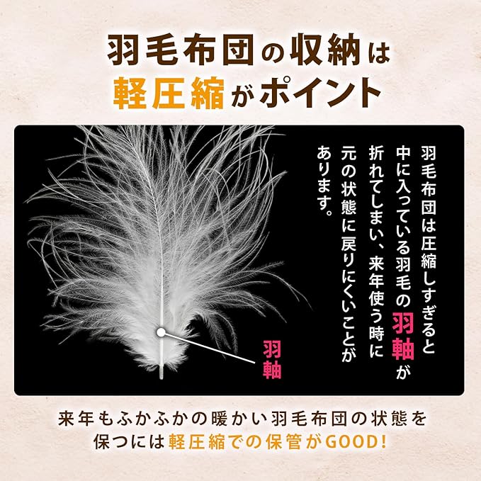 【簡単コンパクト収納】軽圧縮なので羽毛を傷めにくく、ふかふか感や暖かさを次のシーズンまでキープ。