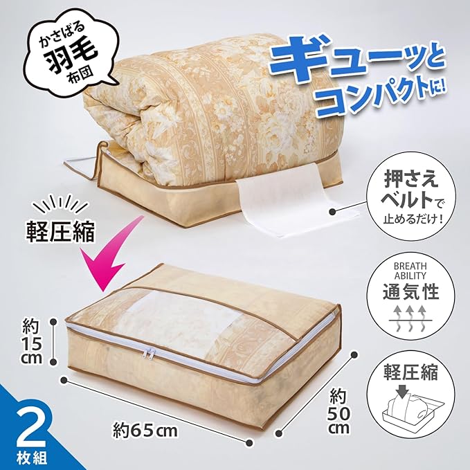 【商品仕様】:本体サイズ/約幅65 奥行50 高さ15cm、内容/2枚組、カラー/ベージュ、材質/ポリプロピレン・ポリエチレン、収納目安/シングルサイズの羽毛布団1枚