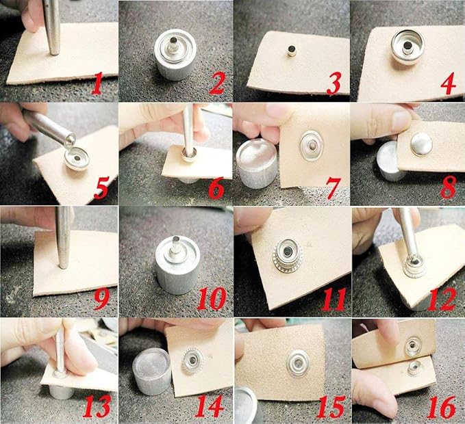 使い方: 小さなパンチで材料に穴を開け、ハンマーを使用して両側のスナップを一緒に押して、メカニズムをしっかりとロックします。