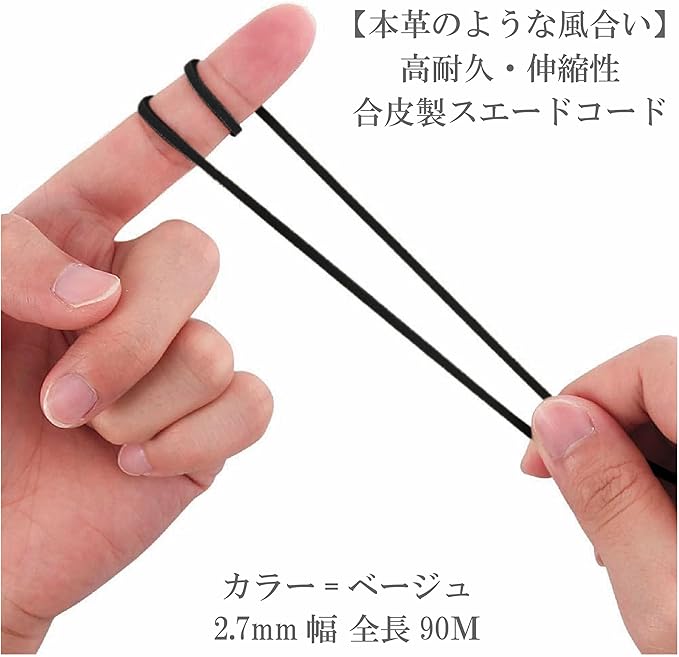 大容量 全長90M(メートル)、紐幅2.7mm。本革のような風合いで高耐久・伸縮性を持つ革紐。ミサンガ, チョーカー , ブレスレット , ネックレス , ストラップ など 、手作りアクセサリー 、ハンドメイド作品 に最適な革紐です。