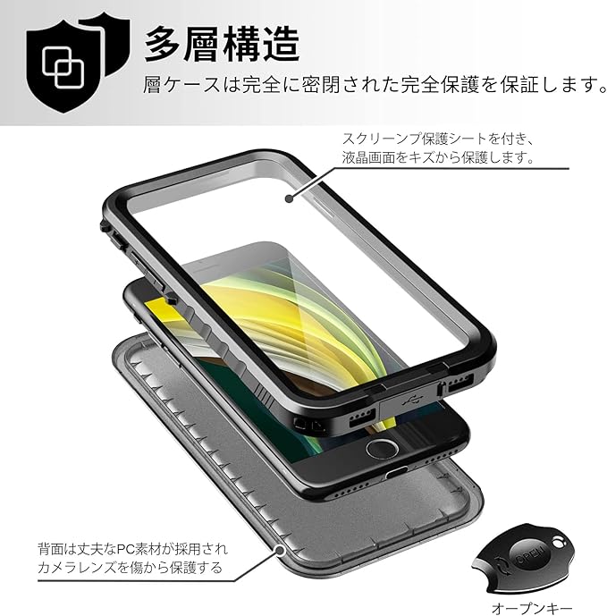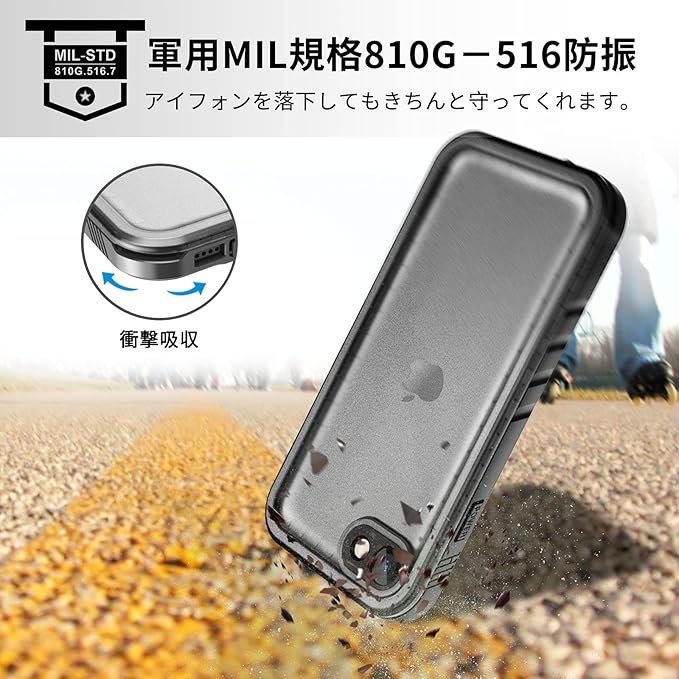 【耐衝撃&全面保護】軍用MIL規格810G-516防振材料が採用されていますので、衝撃にとても強いです。1000回開閉操作しても完全密閉の効果が保持できます。360 全方位からiPhone SE3を保護してくれます。夏の海、プール、砂浜と冬のスキー場など、様々な場所で携帯を快適に活用できます。建築の工事に使用は一番最適です。