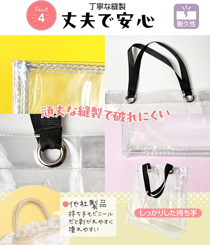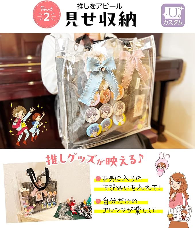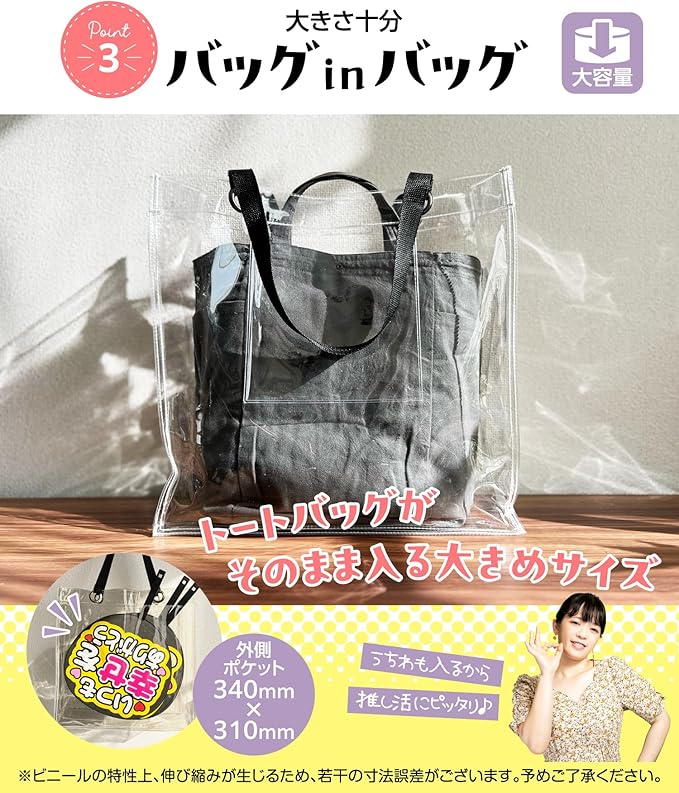 【魅力的な5つのおすすめポイント】丈夫で厚手の生地を使用し、破れにくいので安心して長く使えます。広いマチによる大容量で使いやすく、透明な素材が推しグッズを綺麗に見せます。さらに、急な雨にも大切なアイテムを守り、お気に入りのバッグを中に入れることで可愛さがさらに引き立ちます。