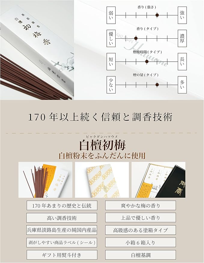 白檀を基調としたさわやかな梅の香りのお線香。 上品でやさしい香り。 兵庫県淡路島産の純国内製品。線香のたき方や、空気の流れにより、燃焼時間に多少の変化せがあります。 線香約40g/小箱 6箱入