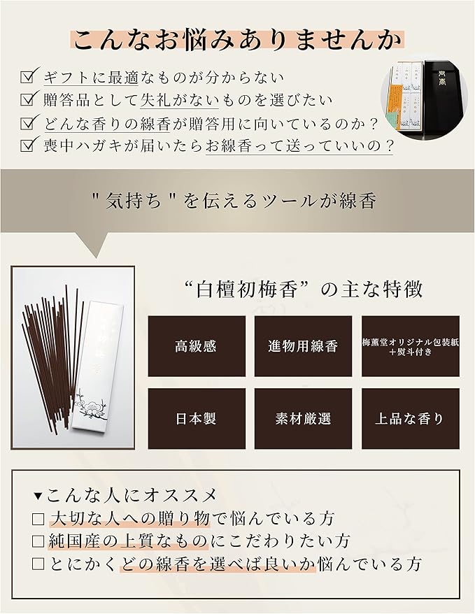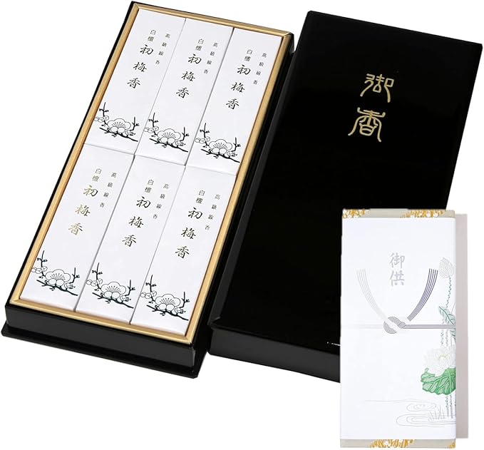 【 包装 蓮のし付き 】梅薫堂 白檀初梅 6箱入 【塗箱】/「心を穏やかにする白檀の香り。大切な人への贈り物に最適なギフト線香。」 日本製 国産 淡路島 ばいくんどう 線香 御香 お香 御供 お供え物 ギフト 進物用 贈り物 贈答用 セット ご霊前 ご仏前 お悔やみ お盆 お彼岸 初盆見舞い 仏壇 仏事 喪中 葬儀 法事 法要 香り 供養 遺族 びゃくだん はつうめ(普賢堂仕様)