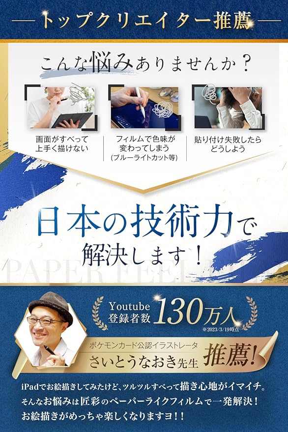 【極める 描き心地 】 ペーパーライクフィルム の摩擦抵抗を 上質紙 よりも向上させ、 描き心地 の向上を図りながら「 紙に描いている感覚 」を追求。 テクスチャ = 紙のような描き心地 です。