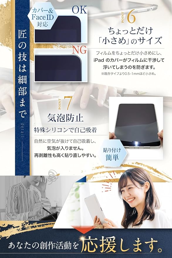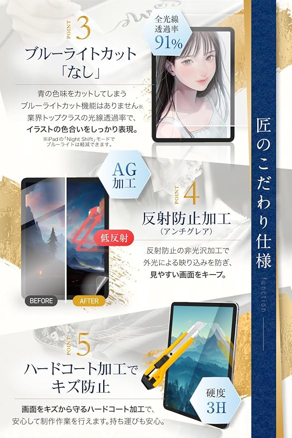 【 反射防止 加工 ( アンチグレア )】 アンチグレア 加工 = 非光沢加工 で光による映り込みを防ぎ、 ipad の見やすい画面 をキープします。
