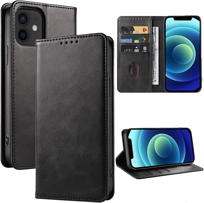 iphone 12/12 Pro ケース 手帳型 携帯カバー レザー 耐衝撃 耐摩擦 軽量 着脱しやすい 全面保護 手触りが良い マグネット式 カード収納 スタンド機能 人気 上質 6.1インチ対応 EUMADOVE (ディープブラック, iPhone 12/12 Pro)