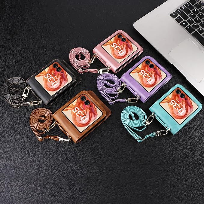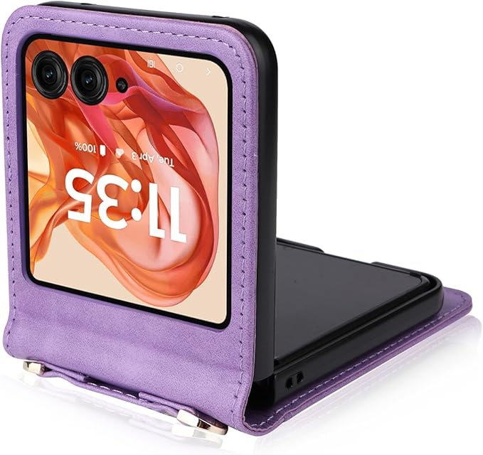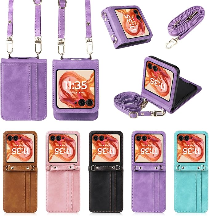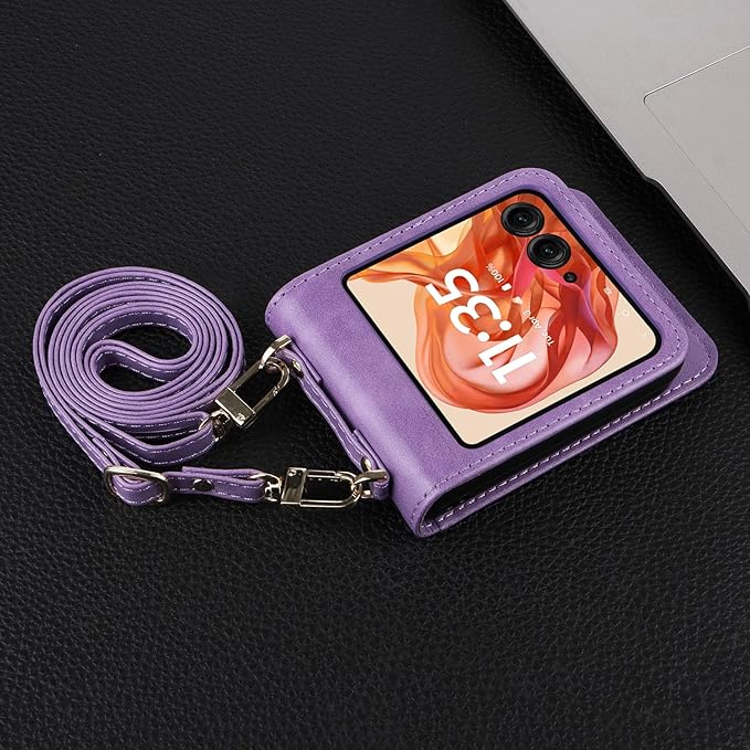 For Motorola Razr 50/Razr 50s/Razr 50d M-51E/Razr 60/60s/60d M-51F ケース カバー Pokaas スマホケース 専用ケース 折りたたみ型 ショルダーストラップ ストラップ付き 肩掛け 斜め掛け 首掛け 背面カード収納 小銭入れ 落下防止 軽量 調節可能ロングストラップ 耐衝撃 (パープル)