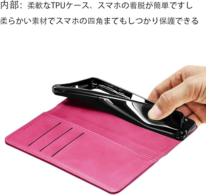 【カードポケット付き】:財布型ケースとして、名刺やお札などを入れるカードポケットがつき、ちょっとしたお出かけにもスマホケース一つでOK!日常生活に便利です。ただし、カードを入れ過ぎると、閉まらない場合がありますので、ご遠慮ください。