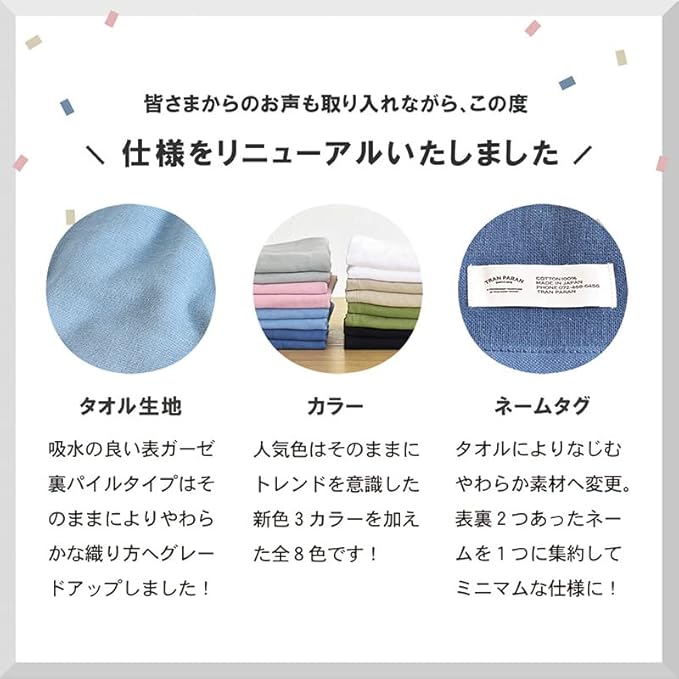 【リニューアル商品】以前のガーゼタオルから試行錯誤を繰り返し、タオル生地、カラー、ネームタグの部分を改良しました!