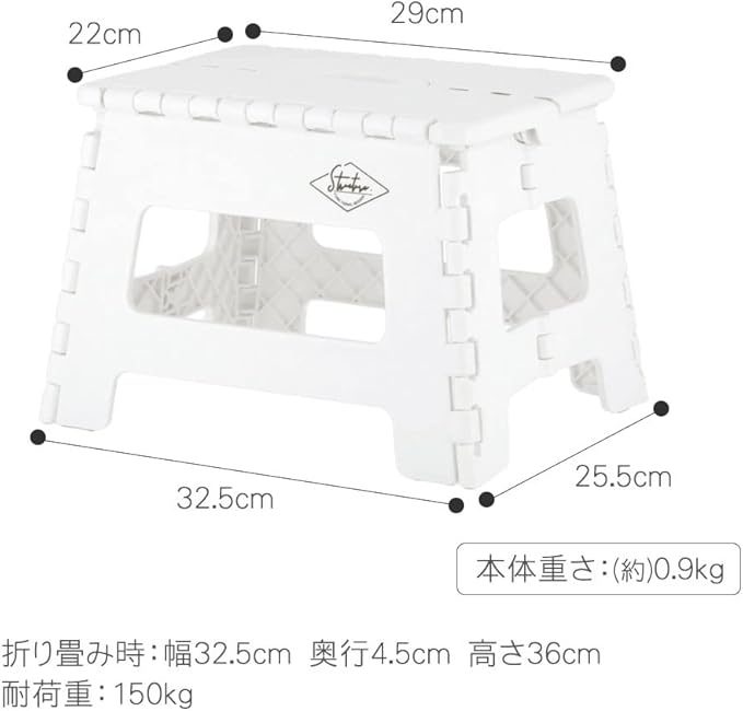 横幅:32.5cm 奥行:22.5cm 高さ:22cm 座面29 22cm 折り畳み時:32.5 4.5 36cm 重さ:0.9kg 耐荷重150kg 素材:ポリプロピレン(本体) TPR(滑り止め)