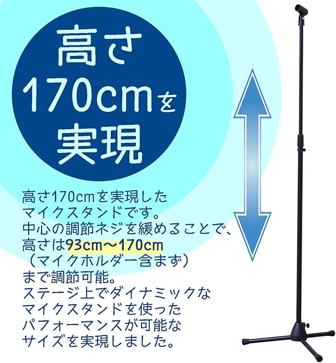 最大高さ170cmを実現したマイクスタンドです。中心の調節ネジを緩めることで、高さは93cm〜170cm(マイクホルダー含まず)まで調節可能。ステージ上でダイナミックなマイクスタンドを使ったパフォーマンスが可能なサイズを実現しました。