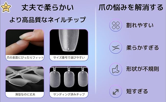 【 安心の長時間耐久性&安全設計 】 高強度かつ強靭性のあるソフトアクリル素材を使用し、長時間剥がれにくい耐久性を実現。どんなにアクティブなライフスタイルでも安心して使用可能です。さらに、日常生活での摩耗にも強く、美しい仕上がりを長くキープできます。使用素材の安全性にも徹底的に配慮。肌に優しい素材を採用し、アレルギーのリスクを最小限に抑えています。耐久性と美しさ、安全性を兼ね備えた、信頼できるアイテムです!