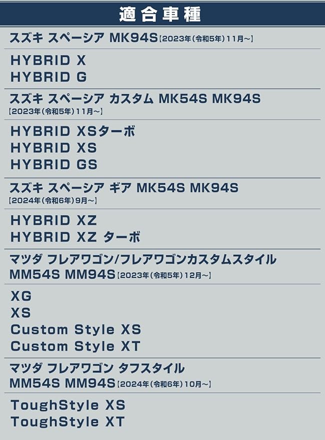 適合車種:スズキ スペーシア/スペーシアカスタム MK54S MK94S(令和5年11月~)、スペーシアギア MK54S MK94S(令和6年9月~)