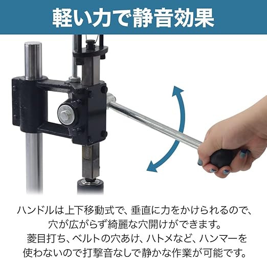 菱目打ち、ベルトの穴あけ、ハトメなど、ハンマーを使わないので打撃音なしで静かな作業が可能です。