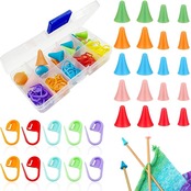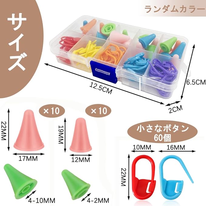 【パッケージ内容】81個セット:大編み針キャップ 10、小編み針キャップ 10、段数マーカー 60、収納ケース付き 1。大サイズ:22 17mm、小サイズ:19 12mm、段数マーカー:10 22mm。カラー:ランダムカラー。