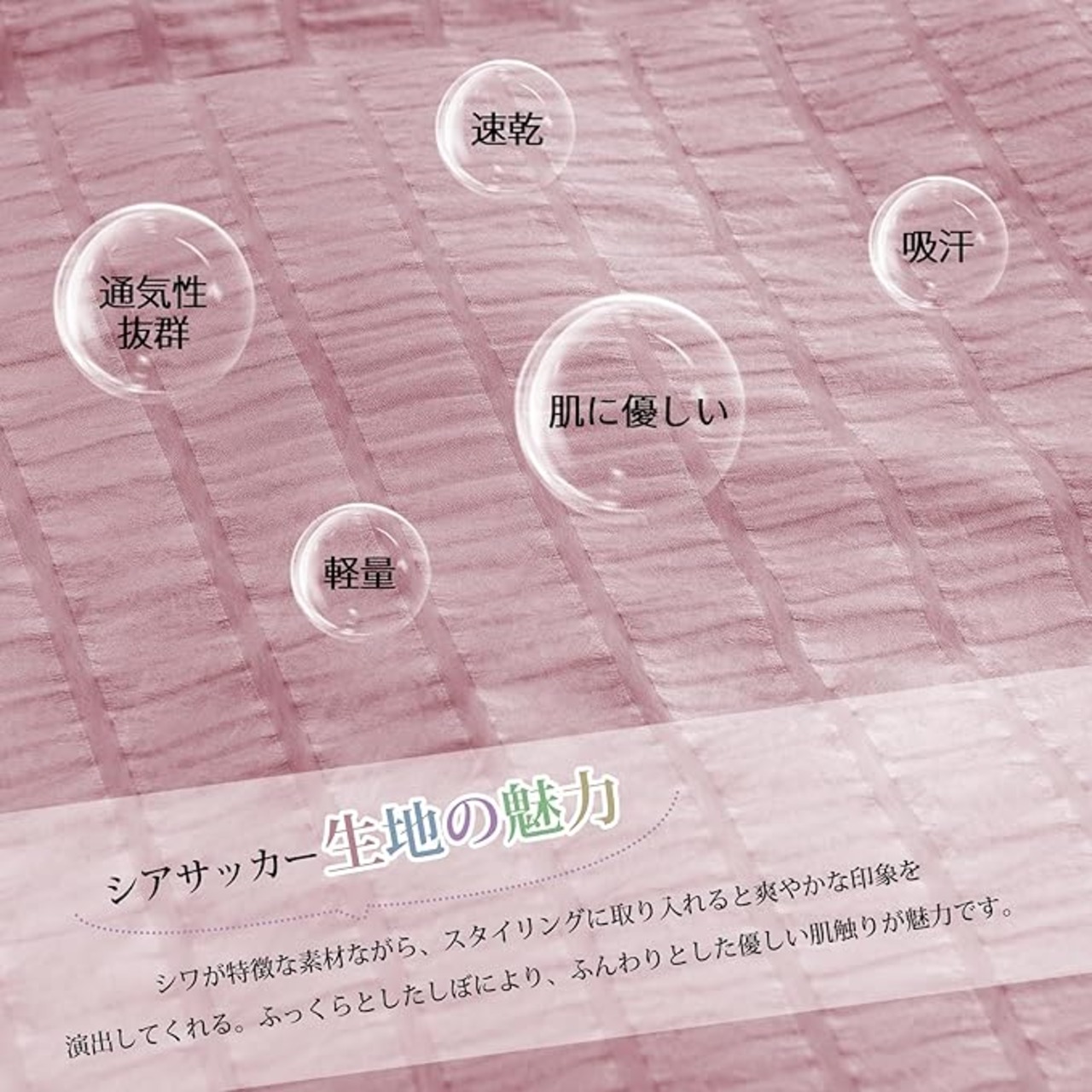 【シアサッカー生地の魅力】:シアサッカーといえば、サラリとした感触で肌触りがよく、涼しくて快適な着心地となっています。波のような縞ができていてシワになりにくいなどの特徴があります。 ふんわりタッチ柔らかな肌触りで、四季を通じて長くご愛用いただけます。 特に夏用でお勧めます。