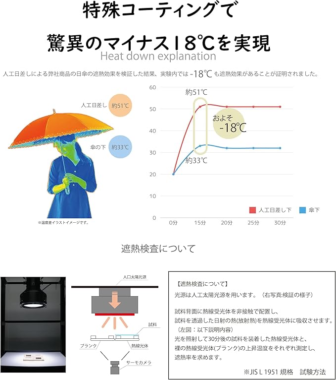 圧倒的な耐熱耐UV素材採用。内側を特殊コーティング、一級遮光でしっかり遮熱。紫外線もUV99.9%カット、UPF指数も最大の50+を実現。しっかりギラギラ太陽から守ってくれます。