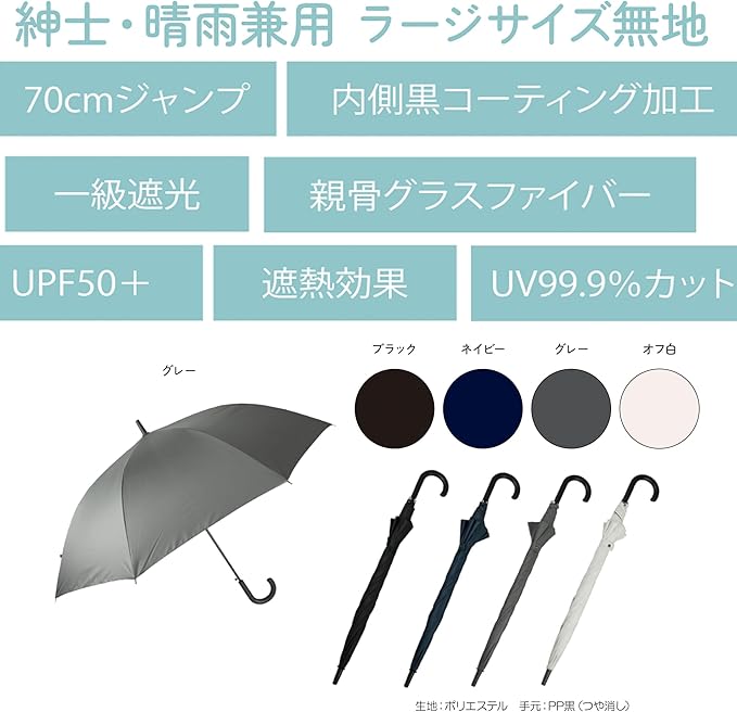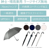 長傘 日傘 晴雨兼用 メンズ 大きい 親骨 70cm 内側コーティング UV99.9%カット 一級遮光 UPF50+ 遮熱 軽量 グラスファイバー ワンタッチ ジャンプ おしゃれ マット仕上げ ハンドル ブラック