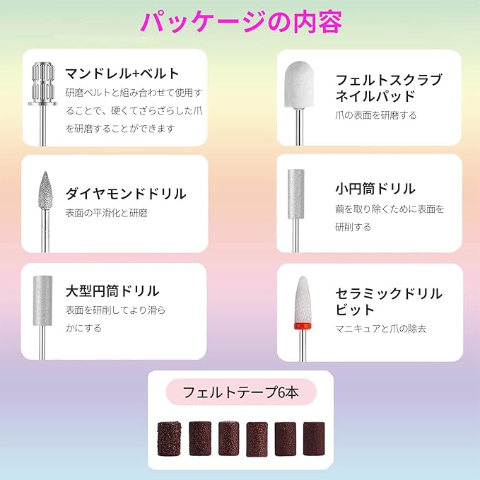 【包装】USBケーブル1本、爪切り6個、研磨テープ6個を含み、研磨、研磨、彫刻、天然アクリル爪除去、ゲル甲油浸粉、角質層などのほとんどの用途に適している。