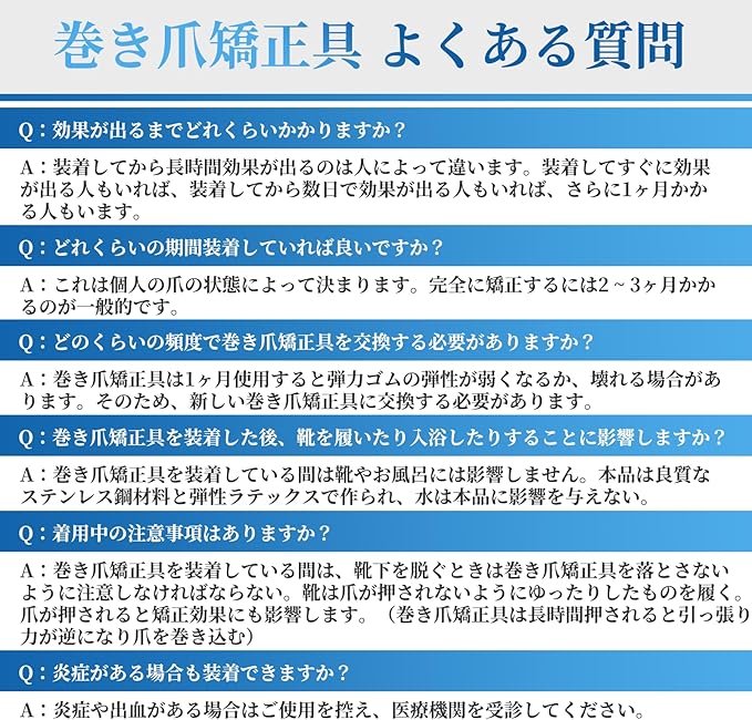 【有効期間】本品は約30日間使用すると、弾性ゴムの弾力性が低下しますので、新しい製品に交換するのはおすすめです。軽度に爪が陥入している方は、本品を1〜2ヶ月装着する必要があります。重度の方は、本品を2〜3ヶ月装着する必要があります。※個人の爪の状態によって決まります。