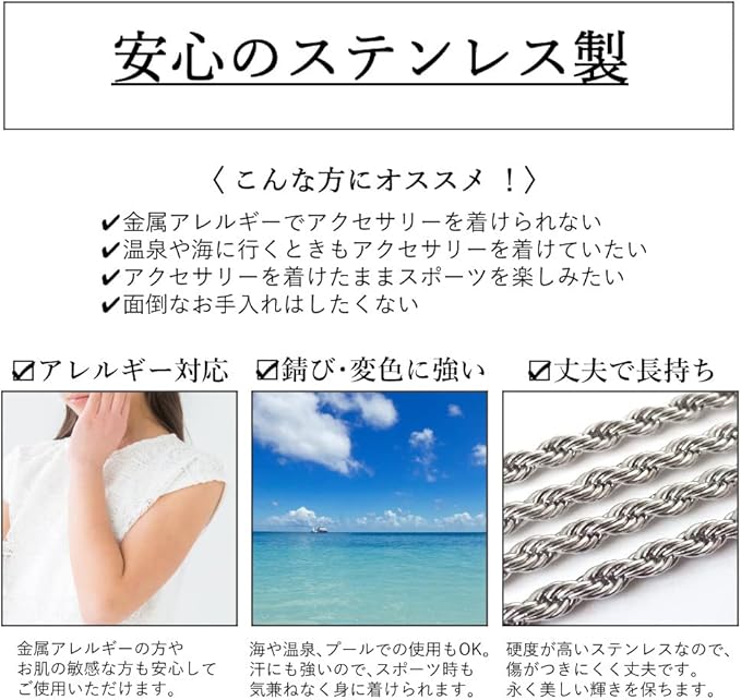 安心のステンレス製です。アレルギー反応のきわめて低い素材ですので、お肌の敏感な方も安心です。