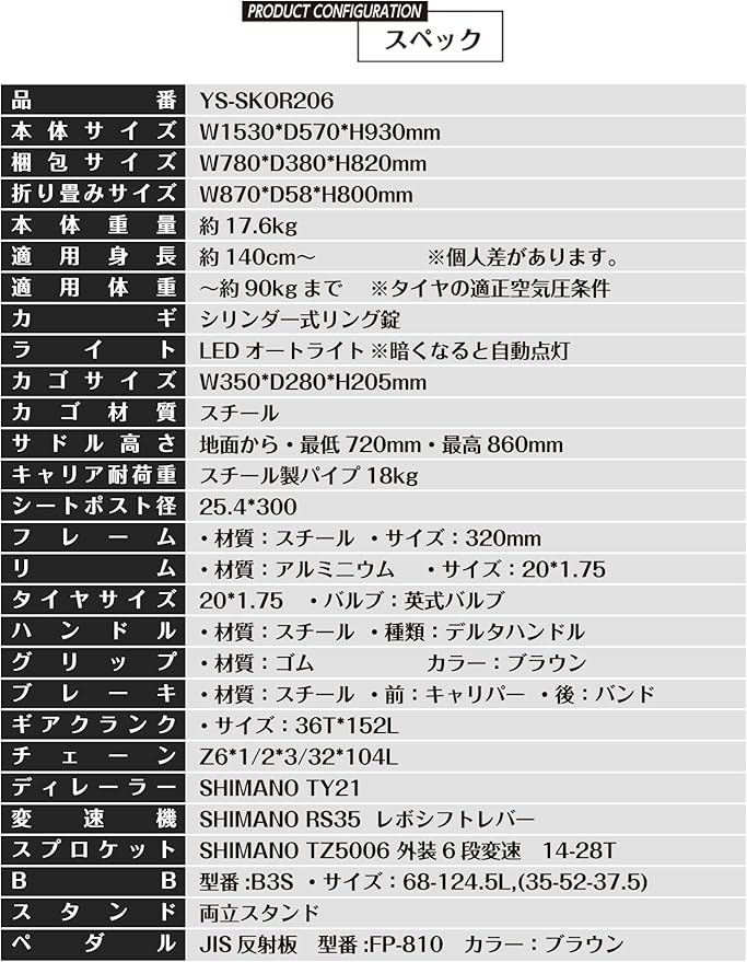 キャリア耐荷重 : スチール製パイプ18kg シートポスト径 : 25.4*300 フレーム : ・材質:スチール・サイズ:320mm リム : ・材質:アルミニウム・サイズ:20*1.75 タイヤサイズ : 20*1.75 ・バルブ:英式バルブ