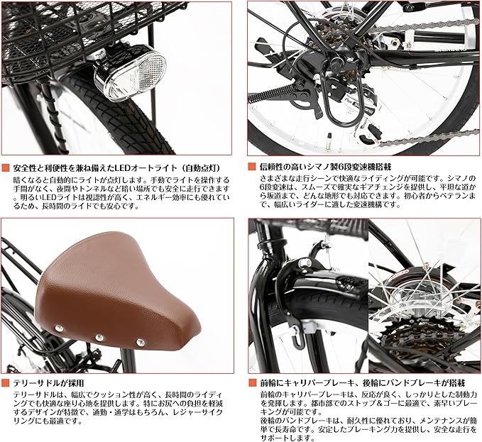 さまざまな走行シーンで快適なライディングが可能です。シマノの6段変速は、スムーズで確実なギアチェンジを提供し、平坦な道から坂道まで、どんな地形でも対応できます。初心者からベテランまで、幅広いライダーに適した変速機構です。