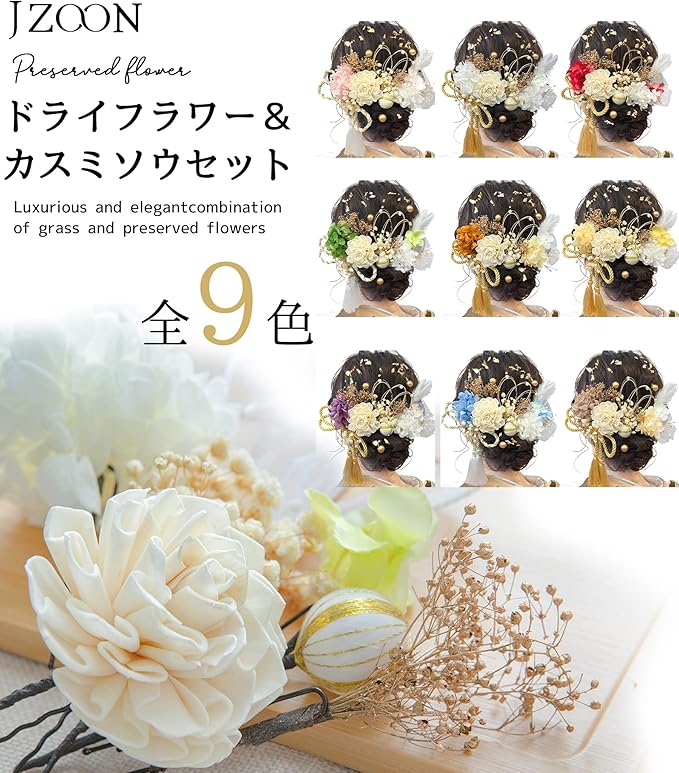 【使用場面多様】その日の髪型に合わせて、ぎっしりつめてつけるのも、バラバラに分けてつけるのも可愛く仕上げます。嬉しい9色展開です。結婚式、成人式、七五三、卒業式、お祭りなどの着物、袴、浴衣にピッタリ。お子様から大人まで幅広い年齢層でお使いいただけます。