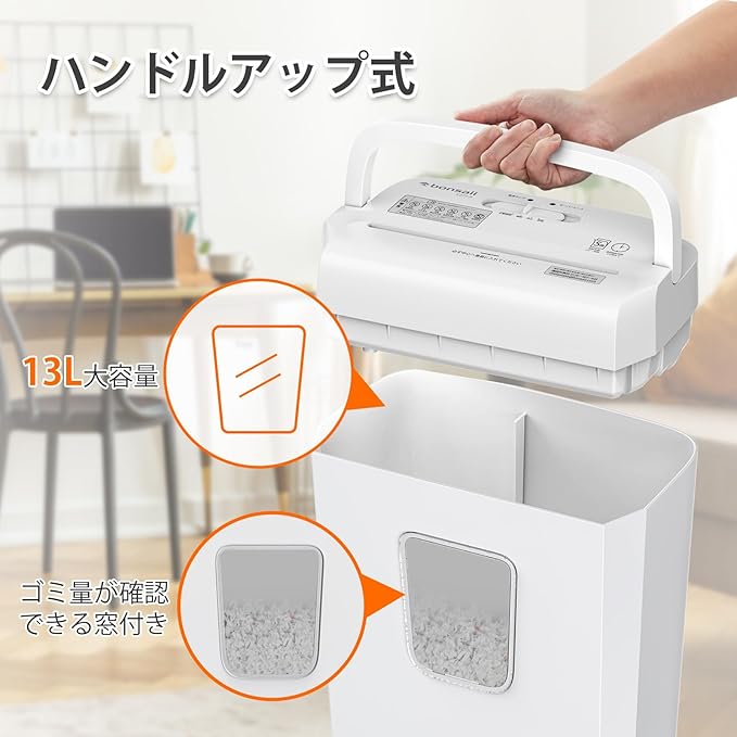bonsaii シュレッダー 細断枚数5枚 マイクロカット4x12mm 13L大容量 カード類対応可能 家庭用 ハンドルアップ式 コンパクト デザイン ホワイト C277-A白