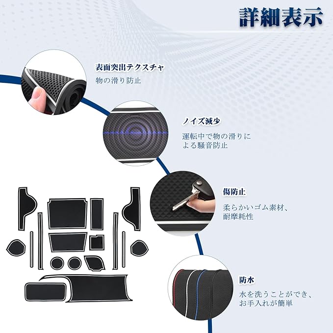 安全設計:「夏の車内でプラスチック臭が気になる」「小さな子供が触れても大丈夫?」そんな不安を解消する無毒PVC素材。高温下でも有害物質を放出せない安全性を実現。育児も安心して使える環境配慮型設計です。
