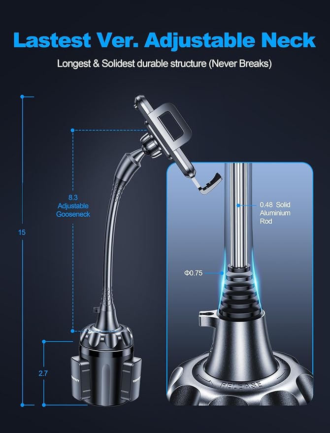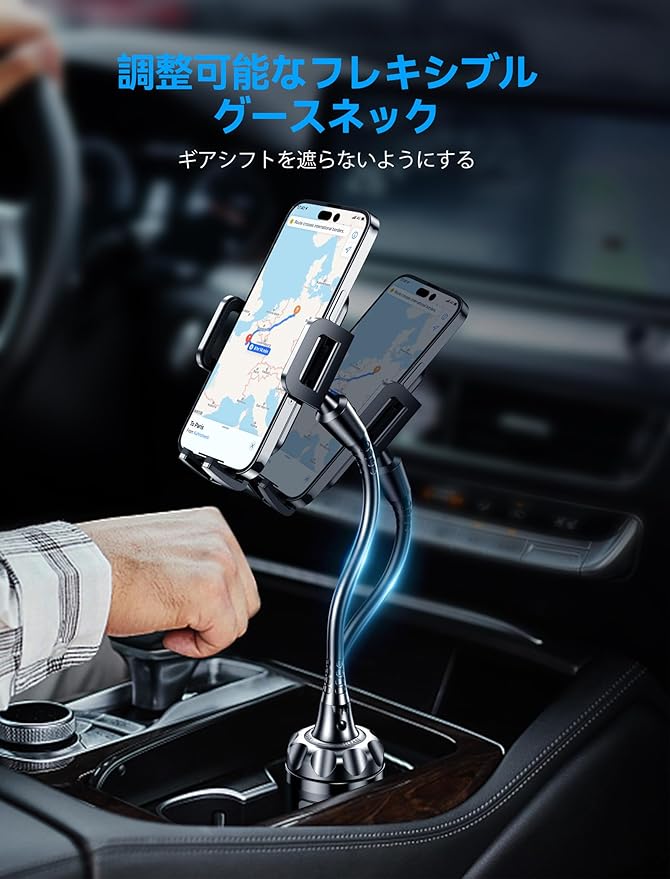 【2024年進化型・360度自由回転・最適な角度】このスマホホルダー 車 ドリンクホルダーは自由調節可能なグースネックがあり、より深い深さとより長い長さを実現することができ、スマホの装着部分は360度回転可能で、縦・横・上下・左右など運転中のお好みやニーズに合わせて、最適な視野角に調整できます。より深いスマホホルダー(最大2.1cm)、より広いスペース(最大10.2cm)。ワンタッチリリース機能を備えた曲げサイドアームと伸展可能な足を備えています。柔らかいシリコンパッドが付いているため、スマホを傷つけることなく、同時にしっかり固定され、揺れません。