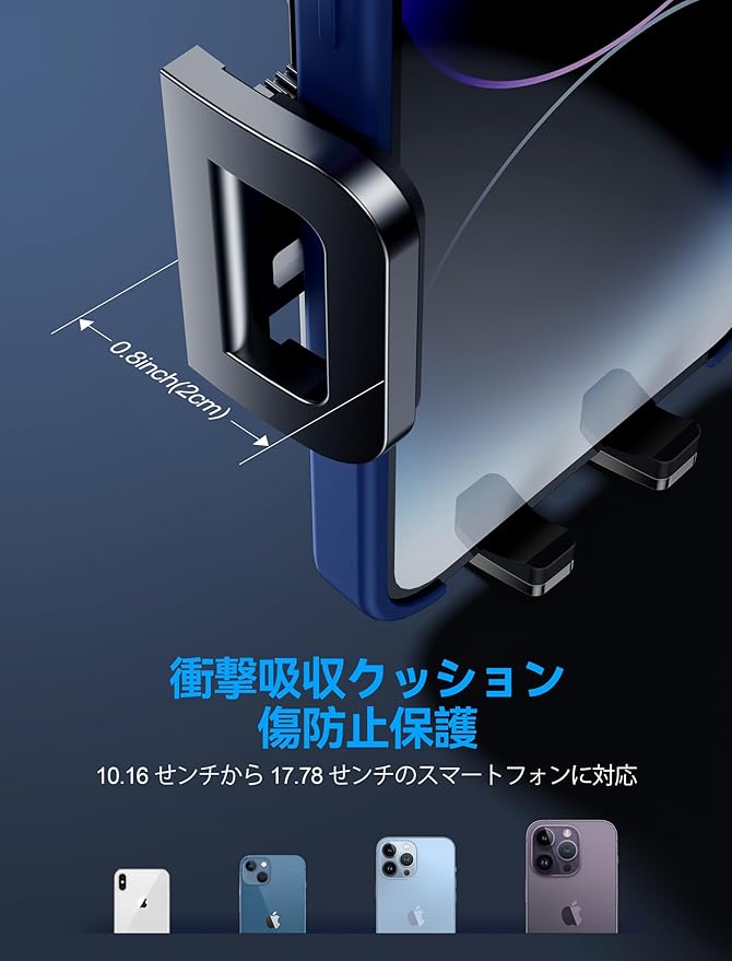 【ほぼ全てのスマホ対応可能】 iPhone 16/plus/pro/pro max、iPhone 15/plus/pro/pro max、 iPhone 14/plus/pro/pro max、iPhone 13 Pro Max、12 Mini、11 Pro/SE 2/XS Mas/XR/8/7 Plus/6s、galaxy S22 Ultra/S21/20/10/S 9+/S8 Plus/S7 Edge/Note 20/10/9、ファーウェイ、HTC、LG、MOTO、GPS、Googleピクセル、Nexus、Nikia、Oneplusなど、4インチ~7インチ幅のデバイスに対応。本製品を使用する場合、ケース、ソケットマウント、または電話に取り付けたものを取り外す必要はありません。最大2 cmの厚さのデバイスに対応。