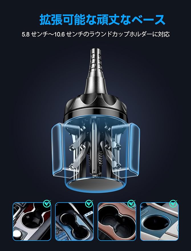 【拡張可能なベース・取り付け簡単】延長器を接続すると、最大直径10.2 cmまで、ほぼすべてのカップホルダーにフィットします。自動車、RV、SUV、トラック、タクシー、テスラ、ヨット、ゴルフカートだけでなく、ベビーカー、ランニングマシン、ソファのドリンクホルダーにもフィットします❗❗初心者でもすぐ使いこなせるように、車への取り付けがとても簡単です。
