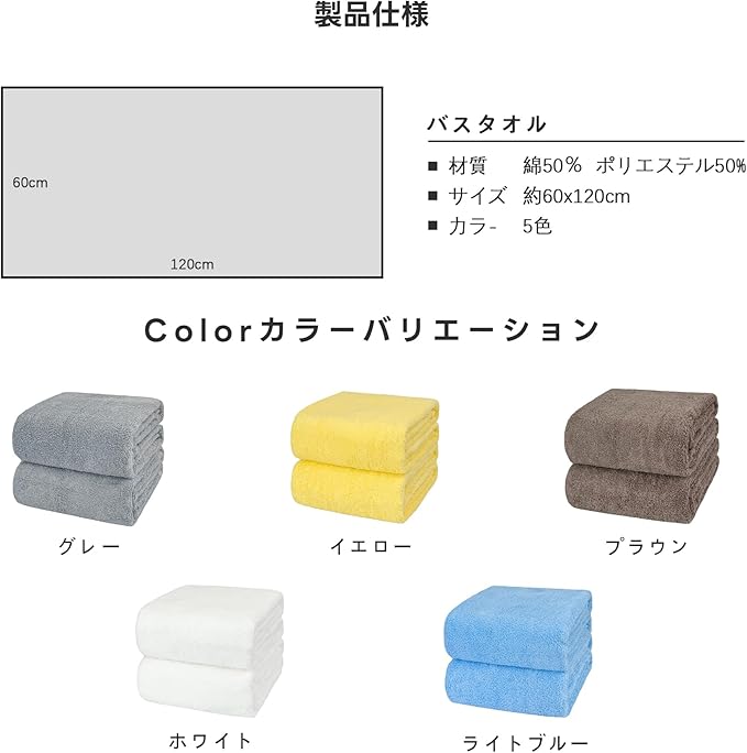 1.タオル 2枚セット:家族みんなでオールシーズン使えます! サイズ:60x120cm 素材:綿50% ポリエステル50% 重量:約125g 特徴:吸水・速乾・絞りやすい・蛍光染料なし。パッケージ:紙製の箱に入ります。