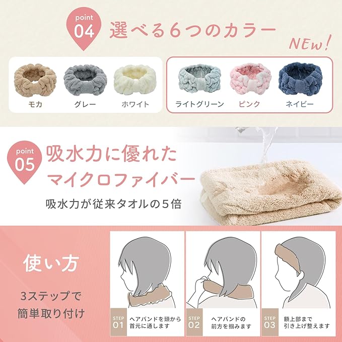 【全体仕様について】極細繊維のマイクロファイバーを使用し、髪の毛に優しいシャーリング仕様のヘアバンドです。吸水・速乾・軽量・糸抜け防止・通気性が強く、静電気も発生しにくくなっています。