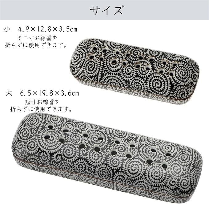 線香皿のサイズは大と小の2種類ございます。小はショートタイプのお線香を、大は一般的なお線香を折らずにそのまま使用できる大きさです。お使いになられるお線香や置く場所、お線香を燃焼させたい時間などに合わせて、お好みのサイズをお選びください。