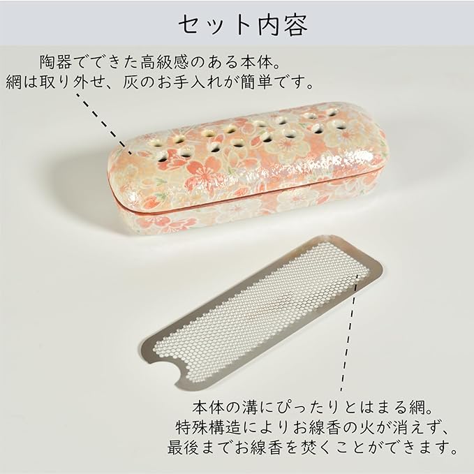 お線香を寝かせて焚くことのできる線香皿です。付属の網の上にお線香を寝かせ、火をつけるだけ。一般的な、お線香を立たせるタイプの香炉と違い、香炉灰を用意する必要がありません。燃焼時に熱い灰が飛び散らないため、お仏壇はもちろん、冷暖房などの風が気になる場所や、寝室など火の元に気を付けたい場所、お子様のいるご家庭でも気軽にお線香をたくことができます。お線香を燃やしたまま香炉の蓋を閉めることができるため、ちょっと離席したいときなども安全です。