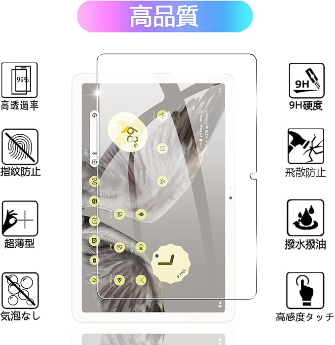 【9H硬度 飛散防止】 対応 Pixel Tablet ガラスフィルム はす旭硝子で作られており、タブレット保護フィルムの中で高レベルの9H硬度に達しています。手にフィットして持ちやすく滑りにくいので落ちにくいです。万が一落ちてもフィルムが衝撃を吸収してくれるので、スクリーンの損傷を低限まで抑えられます。また、特殊な飛散防止設計により、ガラスが割れても飛散しないため。